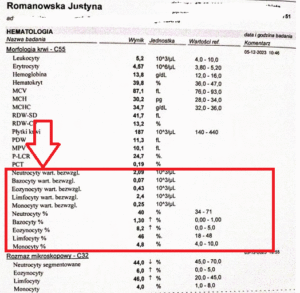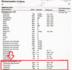 U dołu wyniku zostały przedstawione bardziej szczegółowe parametry dotyczące moich białych krwinek -rozmaz automatyczny. U Was będzie to wyglądało podobnie. Tu kolejna informacja – wśród białych krwinek można wyróżnić różne komórki, ich „subpopulacje” to tak jak pośród wszystkich pracowników przychodni możemy wyróżnić pracujących tam lekarzy, pielęgniarki, personel sprzątający, personel rejestracji itd.. Tak tu pośród leukocytów widzimy, kolejno – jak na wyniku: neurocyty, bazocyty, eozynocyty, limfocyty, monocyty. Przy czym początkowo są przedstawione ich wartości bezwzględne, a dalej ze znakiem % – ich udział procentowy.